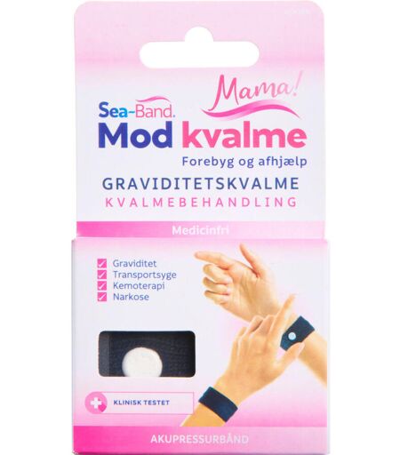Sea-Band er et akupressurbånd, som anvendes mod kvalme. Afhjælper eller lindre kvalme ved transportsyge, graviditetskvalme og kvalme fra medicin. Sea-Band virker ved at udøve et let tryk på et akupresurpunkt under hvert håndled. Sea-Band tages på forebyggende, inden kvalmen opstår. Er kvalmen opstået, kan virkningen forventes efter få minutter. Bemærkning Sea-Band kan håndvaskes med en mild sæbe.Tag båndet af, hvis hånden hæver.Sea-Band kan muligvis have indflydelse på virkningen af andet medicinsk udstyr som f.eks. katetre eller blodtryksmålere. Ved tvivl, kontakt venligst egen læge. ...