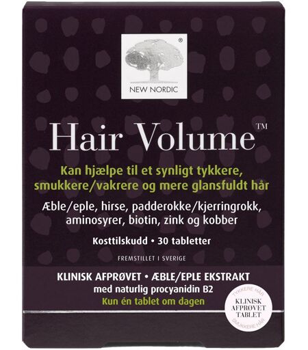 New Nordic Hair Volume 30 Pieces er et kosttilskud til voksne. Hair Volume™ er en klinisk dokumenteret hårtablet som giver et synligt tykkere, smukkere og mere glansfuldt hår. Hair Volume™ er baseret på æble ekstrakt i kombination med hirse, padderokke/kjerringrokk, aminosyrer, biotin, zink og kobber. Indholdet af zink og biotin hjælper med at vedligeholde et normalt hår og en normal hud. Zink bidrager desuden til at vedligeholde normale negle. Kobber bidrager til en normal pigmentering af håret. Fordele: Kosttilskud Til voksne 30 tabletter Til håret Indeholder styrkende ingredienser Laktosefri Glutenfri Daglig dosis: Tag 1 tablet dagligt i forbindelse med et måltid eller et glas vand Indeholder 30 stk, svarende til 30 dages brug Næringsindhold pr daglig dosis Æble ekstakt (Malus domestica, Borkh.) med naturligt indhold af procyanidin-B2 300 mg Hirse ekstrakt (Panicum miliaceum, L.) med naturligt indhold af miliacin 250 mg Padderokke ekstrakt (Equisetum Arvense, L.) med naturligt indhold af silicium 200 mg L-cystein 60 mg L-methionin 50 mg Biotin 475 ug Pantothensyre 30 mg Zink 8 mg Kobber 0,4 mg Ingrediensliste: Fyldemiddel (mikrokrystallinsk cellulose, tværbunden natrium carboxymethyl cellulose) Æble ekstrakt (Malus domestica Borkh) Hirse ekstrakt (Panicum miliaceum L.) Padderokke ekstrakt (Equisetum arvense L.) L-cystein L-methionin Calcium-D-pantothenate Overfladebehandlingsmidler (magnesiumsalte af fedtsyrer, hydroxypropylmethylcellulose) Zinkoxid Antiklumpningsmiddel (siliciumdioxid) Cuprisulfat D-biotin OBS: Anbefalet dagligt dosis bør ikke overskrides. Kosttilskud har til hensigt at supplere kosten og bør ikke træde i stedet for en varieret kost og sund livsstil. Bør opbevares uden for små børns rækkevidde. Bør kun efter aftale med læge eller sundhedsplejerske anvendes af gravide, ammende eller børn under 11 år. ...