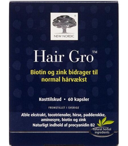 Hair Gro kapsler 60 stk. Hair Gro kapsel tilfører næringsstoffer til hovedbunden og hårsækkene. Indholdet af biotin og zink bidrager til normal hårvækst. Dispenseringsform Kapsler Dosis og anvendelse 2 tabletter dagligt i forbindelse med et måltid. Den anbefalede dosis bør ikke overskrides. ...