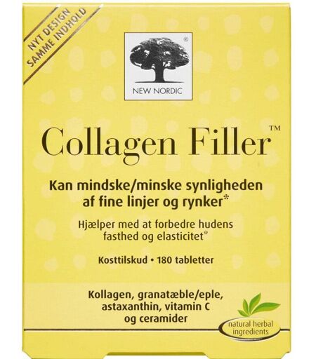 Skin Care collagen filler tabletter 180 stk. Skin Care collagen filler er en hudplejetablet, der tilfører huden næringsstoffer indefra for en fin hud. Mindsker synligheden af fine linjer og hjælper med at forbedre hudens fasthed, elasticitet og følelsen af en god fugtet hud. Dispenseringsform Tabletter Dosis og anvendelse Tag 4 tabletter dagligt de første 8 uger, 2 tabletter om morgen og 2 tabletter om aftenen. Herefter kan den anbefalede dosis sættes ned til 2 tabletter dagligt. Det anbefales at bruge produktet minimum i 3 - 6 mdr. ...