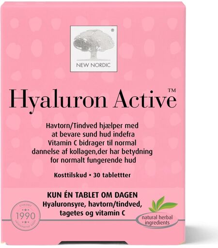 New Nordic Skin Care Hyaluron Active 30 Pieces er et kosttilskud med havtorn der hjælper med at vedligeholde sund hud indefra og vitamin C bidrager til normal dannelse af kollagen der har betydning for normalt fungerende hud. Tabletten er baseret på hyaluronsyre, værdifulde urteekstrakter samt vitamin-C. Hyaluronsyre er en velkendt substans. Havtorn er en klassisk nordisk ingrediens, der hjælper med at bevare en sund hud. Tagetes har et naturligt indhold af lutein. Vitamin C hjælper med at beskytte celler mod oxidativ stress. Vitamin C bidrager til normal dannelse af kollagen der har betydning for normalt fungerende hud. Kollagen er en vigtig strukturel komponent af flere væv i huden, bla. bindevæv, inkl. elastin, som har betydning for hudens fasthed. Fordele: Kosttilskud Voksne Hjælper med at bevare sund hud indefra Laktosefri Glutenfri Daglig dosis: Tag 1 tablet dagligt i forbindelse med et måltid Indeholder 30 stk, svarende til 30 dages brug Næringsindhold pr daglig dosis Hyaluronsyre 48 mg Hydrolyseret kollagen 4 mg Havtorn ekstrakt (Hippohaë rhamnoides L.) 350 mg Tagetes ekstrakt (Tagetes erecta L.) - standardiseret til 5% lutein = 15 mg lutein 300 mg Vitamin C - 40 mg Ingrediensliste: Havtorn ekstrakt (Hippophaë rhamnoides L.) Tagetes ekstrakt (Tagetes erecta L.) Fyldemidler (mikrokrystallinsk cellulose, krydsbunden natriumcarboxymethyl cellulose) Natriumhyaluronat L-ascorbinsyre, kartoffelstivelse Overfladebehandlingsmidler OBS: Anbefalet daglig dosis bør ikke overskrides. Kosttilskud har til hensigt at supplere kosten og bør ikke træde i stedet for en varieret kost og sund livsstil. Bør opbevares uden for små børns rækkevidde. Bør kun efter aftale med læge eller sundhedsplejerske anvendes af gravide, ammende eller børn under 11 år (hydroxypropylmethylcellulose, magnesiumsalte af fedtsyrer, glycerol), hydrolyseret kollagen, antiklumpningsmiddel (siliciumdioxid) ...