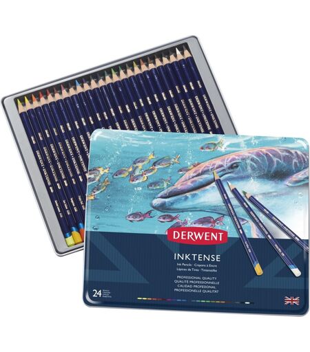 Derwent Inktense FarveblyanterDerwent Inktense farveblyanter er vandopløselige blyanter, der kan tørre permanent, og som giver dig en enestående lagdelingsevne uden at opløse tidligere tørrede lag af levende farver. Intense blyanterne er meget alsidige og kan påføres på mange porøse overflader, herunder keramik, træk og stol. Blyanterne er særligt velegnede til brug på papir og stoffer til en bred vifte af kunst- og håndværksprojekter. 24 forskellige farverLeveres i en flot metalæskeDen stolte historie om engelskproducerede blyanter går helt tilbage til 1832. Allerede i 1938 producerede Derwent den første farveblyant, og lige siden har Derwent haft fuldt fokus på at producere kunstnerartikler i ekstraordinær høj kvalitet og med et konstant øje på innovation. I generationer har Derwent, verden over, været mange kunstneres foretrukne mærke. ...