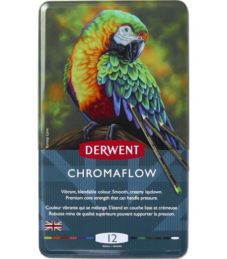 Derwent Chromaflow FarveblyanterDerwent Chromaflow er bløde kernefarveblyanter. Farveblyanterne er højt pigmenterede, hvilket skaber livlighed i skitserne og gør, at farverne skiller sig ud selv på mørkt papir. Den cremede kerne leverer en jævn og hurtig nedlægning, som kan håndtere tryk og modstå brud, hvilket gør det nemt at blande og skygge. 12 forskellige farverLeveres i en flot metalæskeDen stolte historie om engelskproducerede blyanter går helt tilbage til 1832. Allerede i 1938 producerede Derwent den første farveblyant, og lige siden har Derwent haft fuldt fokus på at producere kunstnerartikler i ekstraordinær høj kvalitet og med et konstant øje på innovation. I generationer har Derwent, verden over, været mange kunstneres foretrukne mærke. ...