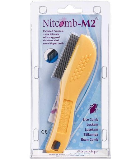 Nitcomb-M2 er en Lusekam til fjernelse af både lus og luseæg. Lusekammen har to rækker ståltænder med henholdsvis fine og meget fine mellemrum, som giver dobbelt effektivitet i forbindelse med kæmningen. Dosis og Anvendelse Tag en lille lok hår. Kæm blidt og omhyggeligt fra hårroden mod hårspidserne.Gentag over hele hovedet. Vær ekstra omhyggelig i nakken og omkring ørene.Skyl og rens mellem kammens tænder hver kæmning.Gentag hver 3.-4. dag til lusene er væk. ...