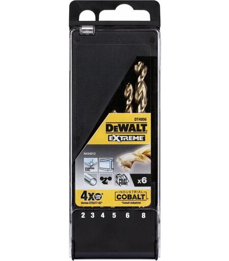 Metalboresættet DeWalt DT 4956 er et 6-delt EXTREME sæt i en plast foldekasse. Metalborene er kerneforstærkede for maksimal brudstabilitet og har en skridsikker aksel med 3 fræsede fastspændingsoverflader. Den unikke centreringsspids muliggør præcis boring. De er lavet af koboltlegeret højtydende skåret stål og er velegnede til højlegeret stål med en trækstyrke på op til 1.100N / mm². ...