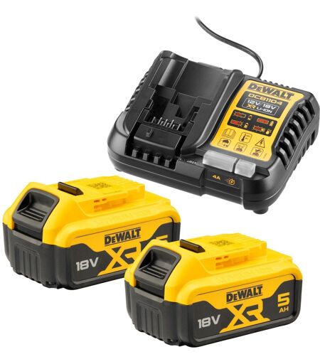 Startsættet DCB1104P2 fra DEWALT består af systemets hurtigoplader DCB1104 og to XR glidebatterier (90Wh) med 18 volt og 5Ah. Batterierne tilbyder en lang driftstid på grund af høj lagerkapacitet og passer til alle 18,0 Volt XR batteridrevne maskiner fra DEWALT. De er ideelle til hård brug på byggepladsen på grund af det robuste hus og de stødsikre loddebattericeller. Opladningsniveauindikatoren med tre lysdioder kan aktiveres med et tryk på en knap. DCB 1104-systemets hurtigoplader oplader alle DEWALT XR glidebatterier fra 1,3 til 5,0 Ah med 10,8 til 18 volt samt 54 volt XR Flexvolt-batterier. 2-trins opladningsprocessen forhindrer batterierne i at blive overophedet og muliggør et stort antal opladningscyklusser med maksimal lagerkapacitet. LED-indikatoren informerer om batteriet og opladningsniveauet. ...