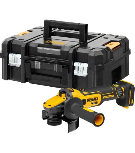Den batteridrevne DCG409NT vinkelsliber fra DeWalt er fra FLEXVOLT Advantage-serien med højere ydeevne, mere kompakte dimensioner, længere driftstid pr. batteriopladning og længere levetid takket være en ny generation af børsteløs motorteknologi. På grund af lavere interne modstande i battericellerne muliggøres et hurtigere strømflow til motoren, så den allerede leverer en mere end 54% højere udgangseffekt og en tilsvarende stærkere trækkraft ved brug af et XR Flexvolt-batteri med f.eks. 6 Ah. Perform &Protect-systemet består af en elektronisk bremse, der pålideligt stopper disken på få sekunder ( ...