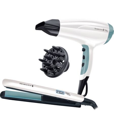 Remington Shine Therapy incl S8500GPl D5216, , Kosmetiksæt unisex, Alt til at få dit hår til at se dejligt ud i én pakke. Kosmetiksættet Remington Shine Therapy incl S8500GPl D5216 indeholder ikke et, men flere produkter, der hjælper dig med at skabe eller berige dine regelmæssige skønhedsrutine rettet mod hårpleje. Denne pakke, der er spækket med hårplejeprodukter, vil glæde både dig eller dine nærmeste som gave. Sættet indeholder: Hårtørrer 1 stk. Glattejern 1 stk. Egenskaber: glatter håret grundigt skader og udtørrer ikke håret kan også bruges til at style bølger keramiske plader ioniseringsfunktion tørrer håret skånsomt eliminerer skadet hår forårsaget af varmebaseret styling en koldluftsfunktion til fiksering af frisuren Brugsvejledning: Brug alle produkterne i det kosmetiske sæt som angivet i vejledningen. ...