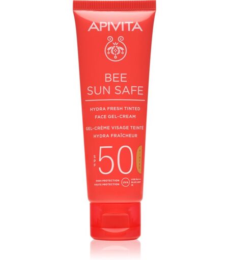 Apivita Bee Sun Safe Hydra Face Tinted Gel-Cream SPF50, 50 ml, Beskyttelse mod sollys til kvinder , Præparatet Apivita Bee Sun Safe giver dit ansigt en sikker beskyttelse mod solens stråler. Egenskaber: beskytter huden mod UVA og UVB stråler virker præventivt mod hudens ældning giver huden den nødvendige fugt produktet skaber ikke bumser eller hudorme Brugsvejledning: Påføres på ren hud før ophold i solen. ...