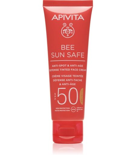 Apivita Bee Sun Safe Anti-Spot and Anti-Age Tinted Face Cream SPF50, 50 ml, Beskyttelse mod sollys til kvinder , Præparatet Apivita Bee Sun Safe giver dit ansigt en sikker beskyttelse mod solens stråler. Egenskaber: beskytter huden mod UVA og UVB stråler beskytter huden mod for tidlig ældning giver intensiv fugt forhindrer en ujævn pigmentering af huden Brugsvejledning: Påføres på ren hud før ophold i solen. ...