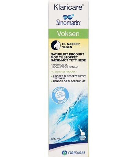 Orifarm Klaricare Næsespray Voksen er en skånsom saltvands næsespray med havvand, der kan bruges mod tilstoppet næse. Kan anvendes af voksne og børn over 6 måneder. Orifarm Klaricare Næsespray Voksen lindrer tilstoppet næse og trykket i bihulerne via osmose, som er en naturlig mekanisme, der trækker overskydende væske ud af næsevævet. Orifarm Klaricare Næsespray Voksen hjælper desuden med at fugte og rengøre næsehulen ved at fjerne ophobet slim, skorper, støv og snavs og forurenende stoffer, allergener og bakterier. ...