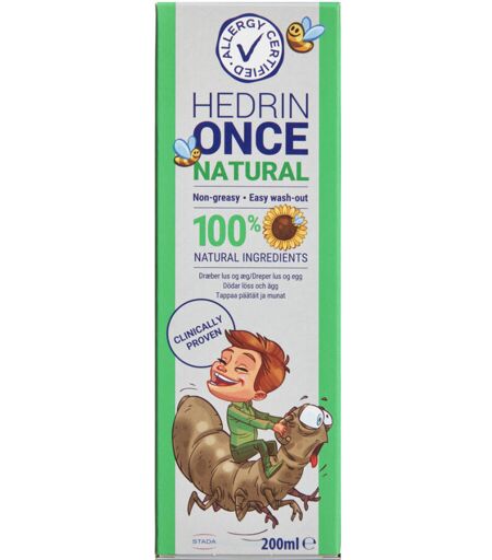 100 % naturlig lusebehandling, der fjerner både lus og æg. Allergicertificeret lusebehandling. Hedrin Once Natural er en naturlig og effektiv behandling mod lus og æg. Den består af hemisqualane og bivoks, der har dobbelt effekt: Den blokerer lusens åndehuller og dehydrerer og rynker insektets hud efter 5 minutter. Hedrin Once Natural ...