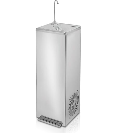 Canaletas koldvandsfontæne m. fodpedal, stål Slip for at røre ved køleren for at tappe vand. Denne drikkevandsfontæne fra Canaletas er robust og samtidig særdeles let at betjene. Modellen er en højkapacitets drikkefontæne som betjenes ved hjælp af en fodpedal, som leverer koldt vand via en hane til udskænkning i glas, kande eller drikkedunk. Maskinen har et enkelt og tidløst design og er udført i rustfrit stål. Vandfontænen er særdeles velegnet til virksomheder, skoler eller andre offentlige steder eller steder med større behov for adgang til frisk drikkevand. Fontænen er en særdeles robust og drift sikker – også i lidt udfordrende omgivelser. Højkapacitets fontænen giver dig 60 liter koldt vand i timen. Maskinen har justerbar koldvandstemperatur. Drikkefontænen kræver tilslutning til vandforsyning, afløb og el Specifikationer: Dimensioner: 350 x 350 x 1030 mm Vandtype: Koldt vand Køleteknologi: Spiral køling Kølekapacitet: 60 liter/timen Kompresser styrke: Hermetisk 65W Kabinet materiale: Rustfrit stål A-304 ekstern/internt Kølemiddel: R290 Lækagesystem: Ja Max strømforbrug: 200W – 0,9A Rumtemperatur: 10-32 0 C Strømforsyning: 220-230V – 50Hz – monofase Vægt: 26 kg Køletemperatur: 4-11 grader C Vandtryks krav: 1,5-4,5 Bar Varmt vand: Nej ...