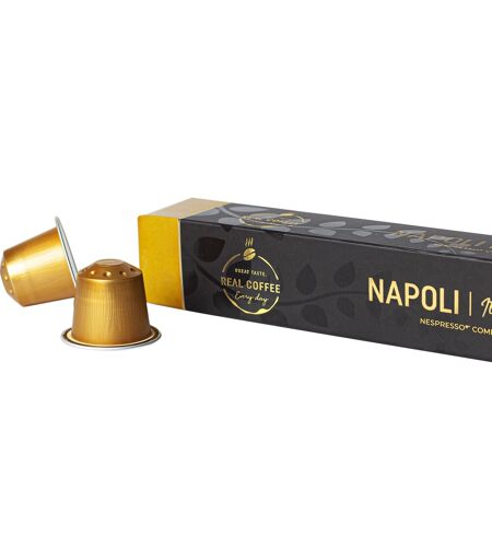 Udsøgt og velsmagende kaffe i genanvendelige aluminiumskapsler Få en eksklusiv kaffeoplevelse med Real Coffee’s aluminiums kaffekapsler, som har præcis samme kvalitet som de originale kapsler - og så kan de tilmed genanvendes.Napoli er med sin udsøgte 100% Arabica blanding, fra højtliggende egne af Sydamerika, karakteriseret af en frugtrig og mild smag. Den mørke ristning og den askeholdige, næringsrige jord tilfører bønnerne en særegen nøddeagtig smag med undertoner af kakao og en forstærket fylde. Cremaen er mørk og skummende, men samtidig fyldig og tyk, hvilket gør Napoli perfekt til alle kaffedrinks. Real Coffee kaffekapslerne kan anvendes i alle originale og klassiske Nespresso kapsel maskiner til små kapsler. Med kapslerne er du altid sikret en lækker friskbrygget kop kaffe.Hos Real Coffee er Fairtrade i højsædet. Fairtrade arbejder for at skabe en bedre løn og gode arbejdsforhold for de kaffebønder og deres familier, som producerer råvarerne til den gode kaffe. Real Coffee gør derfor deres bedste for at du kan drikke din kaffe med god samvittighed. Bønnetype: 100% ArabicaStyrke (skala 1-7): 5 10 aluminiumskapsler pr. æske Nespresso kompatibel til originale maskiner med små kapsler Fairtrade mærketBemærk! Disse små kapsler er kun kompatible med de oprindelige Nepresso kapselmaskiner til mindre kopper kaffe og passer derfor ikke til de nyere Vertuo maskiner til store kopper kaffe. ...