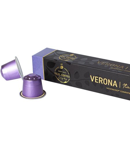 Udsøgt og velsmagende kaffe i genanvendelige aluminiumskapsler Få en eksklusiv kaffeoplevelse med Real Coffee’s aluminiums kaffekapsler, som har præcis samme kvalitet som de originale kapsler - og så kan de tilmed genanvendes.Verona er en intens og mørkristet espresso lavet på 100% førsteklasses Arabica bønner fra Sydamerika. Der er toner af karamel og chokolade i smagen pga. den hårde og mørke ristning. Den lange og kraftige eftersmag og den tykke og fyldige crema gør Verona perfekt til Caffe Latte og Macchiato. Real Coffee kaffekapslerne kan anvendes i alle originale og klassiske Nespresso kapsel maskiner til små kapsler. Med kapslerne er du altid sikret en lækker friskbrygget kop kaffe. Bønnetype: 100% AribicaStyrke (skala 1-7): 610 aluminiumskapsler pr. æske Nespresso kompatibel til originale maskiner med små kapslerBemærk! Disse små kapsler er kun kompatible med de oprindelige Nepresso kapselmaskiner til mindre kopper kaffe og passer derfor ikke til de nyere Vertuo maskiner til store kopper kaffe. ...