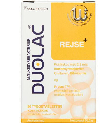 DUOLAC REJSE+ er udviklet til rejsende, der ønsker at støtte deres tarmflora, med et produkt de allerede kender hjemmefra under rejsen, samt en praktisk pakning. Kan indtages i en fart på rejsen uden behov for vand. Hver tyggetablet ...