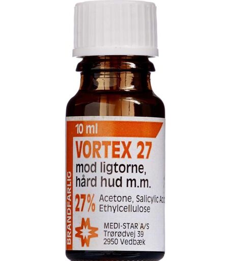 Vortex 27 Ligtornemiddel er et middel mod ligtorne, hård hud m.m. Bemærkning Man bør ikke anvende produktet på modermærker, revnet og betændt hud. Vortex 27 Ligtornemiddel er brandfarligt og bør anvendes med forsigtighed. ...
