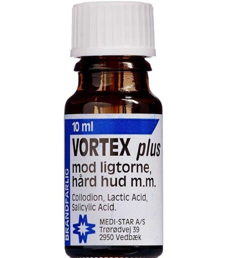 Vortex Plus er middel mod ligtorne, hård hud m.m. Bemærkning Man bør ikke anvende produktet på modermærker, revnet og betændt hud. Vortex Plus er brandfarlig og bør anvendes med forsigtighed. ...