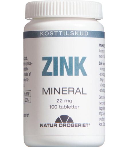 Zink Mineral 22 mg bidrager til immunsystemets normale funktion, at vedligeholde normal hud, hår og negle, at vedligeholde et normalt syn og at vedligeholde normale knogler. Dispenseringsform Tabletter. ...