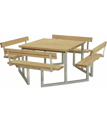 Massive vedligeholdelsesfrie planker Kvadratisk bord-bænkesæt med bløde former, som er særdeles velegnet til udeområder, både i virksomheden, institutioner eller privat. Bord-bænkesættet inviterer til socialt samvær med kollegaer, venner eller familie. Dette bord/bænkesæt har desuden ryglæn for at øge komforten. Sættet er fremstillet i Thermowood som er fyrretræ, der har fået en særlig varmebehandling. Det forbedrer dets indre og ydre egenskaber, så træet er mere holdbart og modstandsdygtigt overfor svampeangreb. Varmebehandlingen involverer intet andet end høj varme og damp. I modsætning til trykimprægnering anvendes der ingen kemikalier eller kunstige tilsætningsstoffer. Du kan læse mere om Thermowood her. Dette produkt er lavet af FSC®-certificeret nåletræ og andet kontrolleret materiale. Farve: Træ Galvaniseret stålstel 42 mm massive planker Dimensioner (HxLxB): 76 x 227 x 227 cm Siddehøjde: 45 cm Certificering: FSC MIX 70% Antal siddepladser: 8 Leveres usamlet Vægt: 112,1 kg. Ryglæn: 4 ...