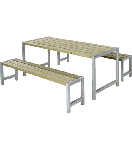 Massive planker i trykimprægneret nåletræ Råt plankesæt med et moderne udtryk, som er særdeles velegnet til ude områder, både i virksomheden, institutioner og privat. Sættet er fremstillet i massivt trykimprægneret træ med et vedligeholdelsesfrit stel i galvaniseret stål, som giver et stringent stållook. Den galvaniserede stål er skabt til at stå ude i hele sæsonen, og vil med tiden få en flot grå patina. Plankesættets konstruktion gør at du vil opleve et hårdført sæt, som vil holde i mange år fremover. Det er velegnet til at stå ude hele året trods vind og vejr hvis plankerne vedligeholdes. Se nærmere info om vedligeholdelse og efterbehandling af produkter fra PLUS her. Dette produkt er lavet af FSC®-certificeret nåletræ og andet kontrolleret materiale. Farve: Natur Galvaniseret stålstel 42 mm massive planker i trykimprægneret nåletræ Dimensioner - bord (HxLxB): 72 x 186 x 77 cm Dimensioner - bænk (HxLxB): 45 x 176 x 38 cm Certificering: FSC MIX 70% Antal siddepladser: 6 Leveres usamlet Vægt: 64,9 kg. ...