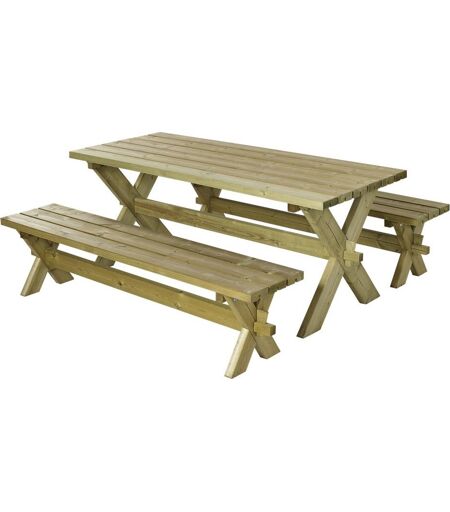 Robuste planker i trykimprægneret nåletræ Sættet er bestående af et plankebord og 2 plankebænke. Det har et klassisk og nostalgisk udtryk med robuste planker, som er særdeles velegnet til ude områder, både i virksomheden, institutioner og privat. Plankesættet er fremstillet i massivt trykimprægneret træ og kræver minimal vedligeholdelse. Både bordet og bænkene står på krydsede ben, som er forbundet med en planke der går på tværs. For hver ende er der kiler, som sikrer stabilitet og fuldfører det klassiske design. De løse bænke gør det nemt og fleksibelt at flytte rundt, så man altid kan nyde solens stråler. Plankesættets konstruktion gør at du vil opleve et hårdført sæt, som vil holde i mange år fremover. Det er velegnet til at stå ude hele året trods vind og vejr hvis plankerne vedligeholdes. Se nærmere info om vedligeholdelse og efterbehandling af produkter fra PLUS her. Dette produkt er lavet af FSC®-certificeret nåletræ og andet kontrolleret materiale. Farve: Natur 42 mm massive planker i trykimprægneret nåletræ Dimensioner - bord (HxLxB): 72 x 177 x 76 cm Dimensioner - bænk (HxLxB): 44 x 177 x 38 cm Siddehøjde: 45 cm Certificering: FSC MIX 70% Antal siddepladser: 6 Leveres usamlet Vægt: 78,5 kg. ...