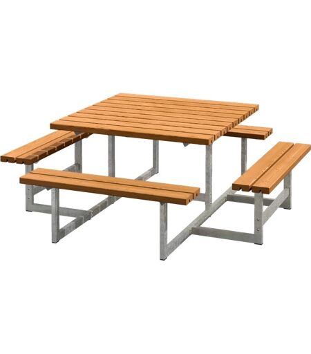 Kvadratisk samtale bord-bænkesæt Kvadratisk bord-bænkesæt med bløde former, som er særdeles velegnet til udeområder, både i virksomheden, institutioner eller privat. Bord-bænkesættet inviterer til socialt samvær med kollegaer, venner eller familie. Sættet er fremstillet i massivt nåletræ med varmgalvaniseret stålstel. Dette havesæt er grundmalet teak, så det fremstår flot og moderne. Se nærmere info om vedligeholdelse og efterbehandling af produkter fra PLUS her. Dette produkt er lavet af FSC®-certificeret nåletræ og andet kontrolleret materiale. 42 mm massive planker i nåletræ Farve: Teak - Nærmeste RAL 1006 (transparent) Overflade: Trykimprægneret og grundmalet teak Dimensioner, bord (LxBxH): 118 x 118 x 73 cm Dimensioner, bænk (LxBxH): 118 x 25 x 45 cm Samlet mål (LxBxH): 200 x 200 x 73 cm Siddehøjde: 45 cm Certificering: FSC MIX 70% Antal siddepladser: 8 Leveres usamlet Vægt: 81,7 kg. ...