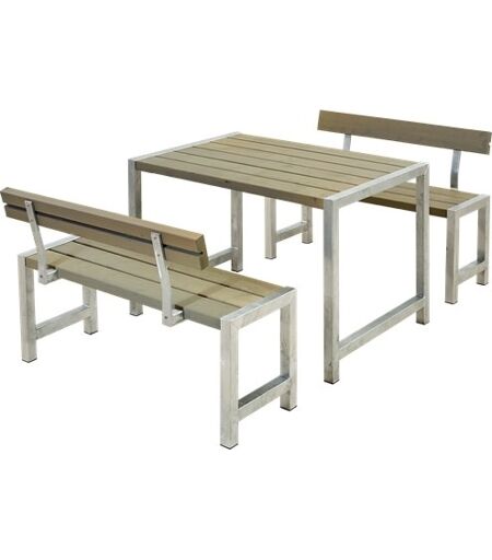 Massive planker i trykimprægneret nåletræ Plankesæt i en klassisk farve som giver et moderne udtryk, som er særdeles velegnet til ude områder, både i virksomheden, institutioner og privat. Sættet er fremstillet i massivt trykimprægneret træ med et vedligeholdelsesfrit stel i galvaniseret stål, som giver et stringent stållook. Den galvaniserede stål er skabt til at stå ude i hele sæsonen, og vil med tiden få en flot grå patina. Plankesættets konstruktion gør at du vil opleve et hårdført sæt, som vil holde i mange år fremover. Det er velegnet til at stå ude hele året trods vind og vejr hvis plankerne vedligeholdes. Se nærmere info om vedligeholdelse og efterbehandling af produkter fra PLUS her. Dette produkt er lavet af FSC®-certificeret nåletræ og andet kontrolleret materiale. Farve: Gråbrun Galvaniseret stålstel 42 mm massive planker i trykimprægneret nåletræ Dimensioner - bord (HxLxB): 73 x 127 x 77 cm Dimensioner - bænk (HxLxB): 75/45 x 127 x 38 cm Certificering: FSC MIX 70% Antal siddepladser: 4 Ryglæn: 2 Leveres usamlet Vægt: 60,9 kg. ...