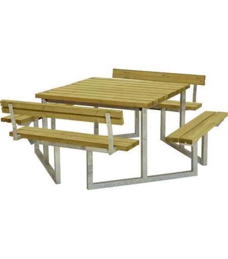 Kvadratisk bord-bænkesæt med fire ryglæn Kvadratisk bord-bænkesæt med bløde former, som er særdeles velegnet til udeområder, både i virksomheden, institutioner eller privat. Bord-bænkesættet inviterer til socialt samvær med kollegaer, venner eller familie. Dette bord/bænkesæt har desuden ryglæn for at øge komforten. Sættet er fremstillet i massivt trykimprægneret nåletræ med varmgalvaniseret stålstel og det kræver minimal vedligeholdelse. Bordbænkesættet er ikke farvebehandlet, så det fremstår flot i natur. Havesættet kan enten males eller olieres, hvis sættet skal fornyes. Se nærmere info om vedligeholdelse og efterbehandling af produkter fra PLUS her. Dette produkt er lavet af FSC®-certificeret nåletræ og andet kontrolleret materiale. 42 mm massive planker i trykimprægneret nåletræ Farve: Natur Mål bord (LxBxH): 118 x 118 x 73 cm Mål bænk (LxBxH): 118 x 25 x 45 cm Samlet mål (LxBxH): 227 x 227 x 76/45 cm Siddehøjde: 45 cm Certificering: FSC MIX 70% Inkl. 4 ryglæn Antal siddepladser: 8 Leveres usamlet Vægt: 112 kg. ...
