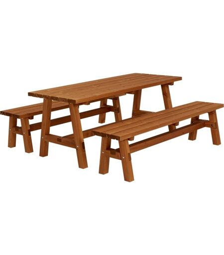 Massive planker i nåletræ Moderne plankesæt i massivt træ, det er velegnet til udeområder, både i virksomheden, institutioner og privat. Sættet er fremstillet i massivt krydsskåret fyrretræ, der giver et blødt og fuldendt look. Plankesættets konstruktion gør at du vil opleve et hårdført sæt, som vil holde i mange år fremover. Det er velegnet til at stå ude hele året trods vind og vejr, hvis plankerne efterbehandles og vedligeholdes korrekt. Dette havesæt er grundmalet teak farvet og fremstår flot og moderne, perfekt til hyggen. Se nærmere info om vedligeholdelse og efterbehandling af produkter fra PLUS her. Dette produkt er lavet af FSC®-certificeret nåletræ og andet kontrolleret materiale. 42 mm massive planker i krydsskåret nåletræ 68 x 68 mm krydsskåret nåletræsstel Farve: RAL 1006 transparent Mål – bord (LxBxH): 177 x 75 x 72 cm Mål – bænk (LxBxH): 177 x 37 x 46 cm Siddehøjde: 46 Certificering: FSC MIX 70% Antal siddepladser: 6 Leveres usamlet Vægt: 78,5 kg. ...