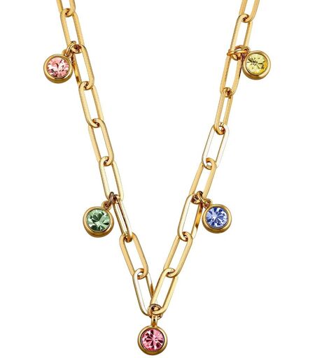 LEONA - er en fed og markant kort halskæde designet i poleret stål med fem bevægelige vedhæng, hver isat en funklende krystalsten i en boks fatning. Kæden er lige fed til en Sweatshirt som en aftenkjole og absolut i særklasse. Kæden er ca 40 cm lang med mulighed for forlængelse. Her vist i guld tonet samt en palet af lyse pastelfarver. Designet i Danmark og fri for cadmium, nikkel og bly. Shop DYRBERG/KERN LEONA HALSKÆDE her. Elsker du også Dyrberg/Kern smykker, ringe, armbånd, ørestikker, øreringe og halskæder? Vi har alt på Dyrberg/Kern shoppen. ...