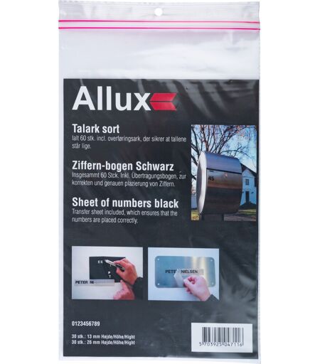 Allux Tal - flotte og stærke tal i høj kvalitet Med en pakke af de flotte folietal fra Allux, kan du nemt og hurtigt sætte nummer på postkassen i privaten eller på jobbet. Tallene er produceret specielt til at fungere til postkasser. Det vil sige, at de er fortrinlige til at holde i mange år i regn, slud og blæst. De giver dig en ubeklagelig klæbeevne og holder deres flotte skinnende farve i mange år frem. Du kan bruge tallene til en lang række andre skilteformål også. De er stærke i brug både inde og ude, og har et flot tidløst fontdesign. Brug dem f.eks. til at angive numre på døre, porte, skure og lign. Farve: Sort Pakken indeholder 30 stk. 13 mm tal og 30 stk. 26 mm tal I alt 60 stk. tal 0,1,2,3,4,5,6,7,8,9 ...