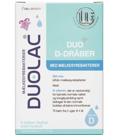 DUOLAC DUO+ D-dråber er til baby og kombinerer mælkesyrebakterier med D-vitamin for at støtte vækst, knogleudvikling og immunforsvar. Hver dosis på 6 dråber ...