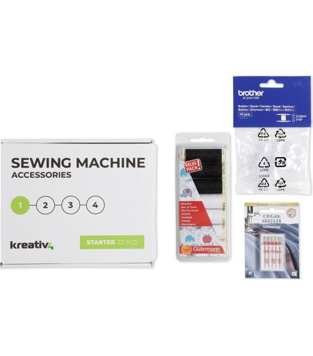 Starter Sykit til din symaskineMed dette tilbehørssæt til symaskiner fra Kreativ4, får du et godt startersæt med 22 dele til din symaskine. Sættet er perfekt til begynderen, da sættet indeholder alt det basale tilbehør du behøver for at komme godt i gang med at sy på maskine.Sættet indeholder:5 Organ universalnåle7 ruller Gütermann sytråd i sort og hvid10 Brother spolerUniversalnålene fra Organ er af høj kvalitet og kommer i størrelserne: 1 x 70/10, 2 x 80/12 og 1 x 90/14 og 1 x 100/16. Nålene kan bruges i mange forkellige typer stof og passer til alle typer af symaskiner og alle mærker.Sytråden fra Gütermann er tråd i høj kvalitet. Der er 100 meter pr. rulle og de er garanteret en knudefri tråd, som er fremstillet af 100% polyester.De klare universal spoler fra Brother passer til alle nuværende typer Brother symaskiner med drop-in spolesystem og de fleste maskiner med horisontalt spolesystem. ...