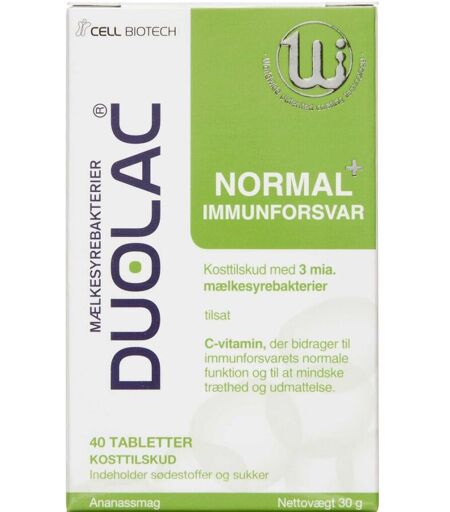 Duolac Normal+ Immunforsvar er mælkesyrebakterier tilsat C-vitamin, der bidrager til immunforsvarets normale funktion. Duolac er kosttilskud til hele familien fra 3 år. Dispenseringsform Tyggetabletter. ...