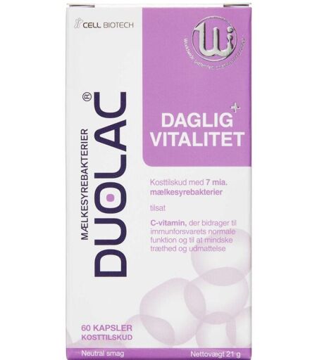 Duolac Daglig Vitalitet er mælkesyrebakterier tilsat C-vitamin, der bidrager til immunforsvarets normale funktion og mindsker træthed og udmattelse. Duolac er kosttilskud til hele familien fra 3 år. Duolac Mælkesyrebakterier er beskyttet af et unikt og patenteret dobbelt coating system, der sikrer optimal beskyttelse mod ydre påvirkninger. Teknologien øger antallet af levende Duolac mælkesyrebakterier, der ankommer til tarmsystemet med op til 100 gange sammenlignet med ubeskyttede bakterier. 100 gange højere overlevelse sammenlignet med ubeskyttede bakterier. Første coating: Mælkesyrebakterierne beskyttes mod galde og mavesyre via en innovativ pH-tilpasset coating. Anden coating: De coatede mælkesyrebakterier omkranses endvidere af en matrix, der beskytter mod ydre påvirkninger som fugt og varme. Dispenseringsform Kapsler. ...