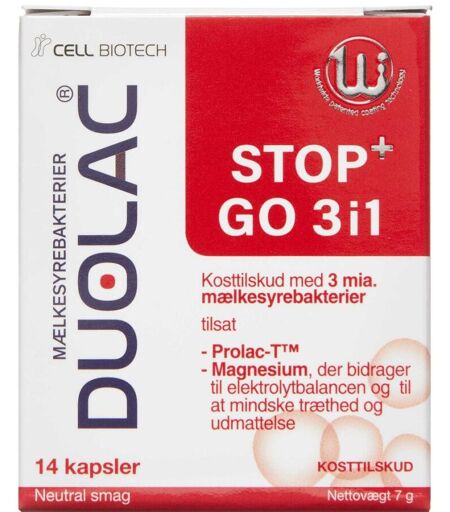 Duolac Stop+Go 3I1 Kapsler er et kosttilskud med 3 mia. mælkesyrebakterier, patenteret Prolac-TTM og magnesium. Et 3I1 kombinationsprodukt med en unik sammensætning af både levende mælkesyrebakterier, varmebehandlede mælkesyrebakterier (Prolac-TTM) og magnesium. Mælkesyrebakterier er en naturlig del af tarmsystemet, og ved at tilføje Prolac-TTM optimeres betingelserne for mælkesyrebakteriernes vækst. Magnesium bidrager til elektrolytbalancen og til at mindske træthed og udmattelse. Brug Duolac Stop+Go 3I1 når du har behov for et tilskud her og nu. Duolac mælkesyrebakterier er beskyttet af et unikt og patenteret dobbeltcoating system, der sikrer optimal beskyttelse mod ydre påvirkninger. Teknologien øger antallet af levende Duolac mælkesyrebakterier, der ankommer til tarmsystemet med op til 100 gange sammenlignet med ubeskyttede bakterier. Pakket i beskyttende atmosfære. ...