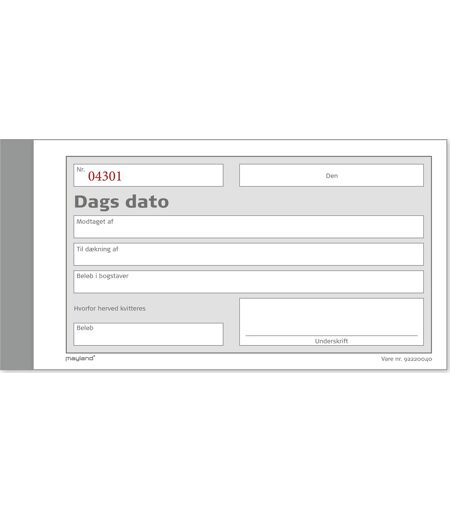 Dags Dato blanketter med nummererede sider Mayland-Burde producerer hvert år flere millioner kalendere til alle formål og har siden 1900-tallet leveret kalendere til danskerne. Sortimentet er baseret og sammensat på baggrund af kundernes ønske om et bredt og tidssvarende udvalg af kalendere. Hos Mayland-Burde bestræber man sig nemlig på at imødekomme kundernes mange forskellige ønsker og behov. Derfor har Mayland udvidet sortimentet med en bred vifte af blanketter og kuponer, designet til at hjælpe med at holde styr på alt fra kassebeholdninger, telefonbeskeder, regninger og garderoben. Her får du en Dags Dato-blok med 2x50 nummererede blade, 1 kopi og indlagt karbonpapir. Der er felter til Dato, modtager, beløb i tal og bogstaver, hvad beløbet skal dække, samt underskrift for modtagelse. Dertil er blokken fremstillet i FSC certificeret papir og andre kontrollerede materialer. Mål (BxH): 148x85 mm Antal sider: 2x50 Farve på skema: Grå Karbonpapir indlagt Nummererede blade Med 1 kopi FSC Mix ...