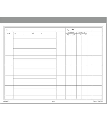 Blok med ugesedler Mayland-Burde producerer hvert år flere millioner kalendere til alle formål og har siden 1900-tallet leveret kalendere til danskerne. Sortimentet er baseret og sammensat på baggrund af kundernes ønske om et bredt og tidssvarende udvalg af kalendere. Hos Mayland-Burde bestræber man sig nemlig på at imødekomme kundernes mange forskellige ønsker og behov. Derfor har Mayland udvidet sortimentet med en bred vifte af blanketter og kuponer, designet til at hjælpe med at holde styr på alt fra kassebeholdninger, telefonbeskeder, regninger og garderoben.Her får du en blok med arbejdsordre og lønseddel i et blad og indlagt karbonpapir.Hver seddel har 6 felter til opgaver med tilhørende dato, timer og overtimer.Mål (BxH): 200x148 mmAntal sider: 2x50Farve på skema: GråKarbonpapir indlagt ...