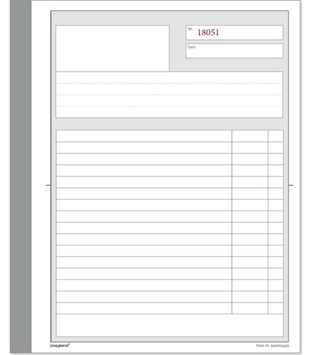 Duplikatbog med talkolonne og indlagt karbonpapir Mayland-Burde producerer hvert år flere millioner kalendere til alle formål og har siden 1900-tallet leveret kalendere til danskerne. Sortimentet er baseret og sammensat på baggrund af kundernes ønske om et bredt og tidssvarende udvalg af kalendere. Hos Mayland-Burde bestræber man sig nemlig på at imødekomme kundernes mange forskellige ønsker og behov. Derfor har Mayland udvidet sortimentet med en bred vifte af blanketter og kuponer, designet til at hjælpe med at holde styr på alt fra kassebeholdninger, telefonbeskeder, regninger og garderoben. Her får du en klassisk duplikatbog, der kan brug til mange forskellige formål i virksomheden. F.eks. følgesedler, regninger, rekvisitioner, timesedler og meget mere. Bogen indeholder 2x50 blade og indlagt karbonpapir. Siderne er nummererede og har felter til dato, firmastempel eller modtager, notater og 16 linjer med talkolonne. Dertil er bogen fremstillet i FSC certificeret papir og andre kontrollerede materialer. Mål (BxH): 148x200 mm Antal blade: 2x50 Karbonpapir indlagt Med 1 kopi FSC Mix ...