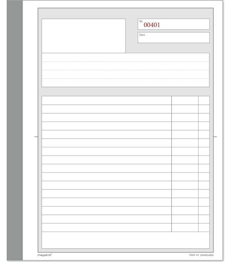Triplikatbog med talkolonne og indlagt karbonpapirMayland-Burde producerer hvert år flere millioner kalendere til alle formål og har siden 1900-tallet leveret kalendere til danskerne. Sortimentet er baseret og sammensat på baggrund af kundernes ønske om et bredt og tidssvarende udvalg af kalendere. Hos Mayland-Burde bestræber man sig nemlig på at imødekomme kundernes mange forskellige ønsker og behov. Derfor har Mayland udvidet sortimentet med en bred vifte af blanketter og kuponer, designet til at hjælpe med at holde styr på alt fra kassebeholdninger, telefonbeskeder, regninger og garderoben.Her får du en klassisk triplikatbog, der kan brug til mange forskellige formål i virksomheden. F.eks. følgesedler, regninger, rekvisitioner, timesedler og meget mere.Bogen indeholder 3x50 blade og indlagt karbonpapir. Siderne er nummererede og har felter til dato, firmastempel eller modtager, notater og 16 linjer med talkolonne.Mål (BxH): 148x200 mmAntal blade: 3x50Karbonpapir indlagtMed 2 kopier ...