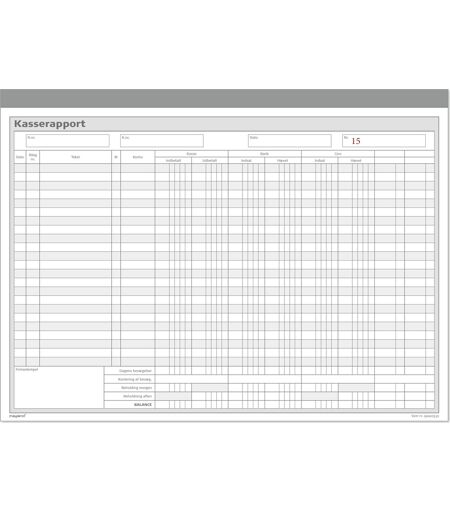 Kasserapport med nummerede sider, kopi og perforeringMayland-Burde producerer hvert år flere millioner kalendere til alle formål og har siden 1900-tallet leveret kalendere til danskerne. Sortimentet er baseret og sammensat på baggrund af kundernes ønske om et bredt og tidssvarende udvalg af kalendere. Hos Mayland-Burde bestræber man sig nemlig på at imødekomme kundernes mange forskellige ønsker og behov. Derfor har Mayland udvidet sortimentet med en bred vifte af blanketter og kuponer, designet til at hjælpe med at holde styr på alt fra kassebeholdninger, telefonbeskeder, regninger og garderoben.Her får du en blok med nummererede kasserapporter, der har kolonner til kasse, bank, giro og en ekstra kolonne. Der er 23 linjer til posteringer, datofelt, felt til firmastempel, felter til afstemning samt R.nr. og K.nr.Karbonpapir er indlagt i blokken, så det der skrives på originalen, automatisk bliver kopieret til bilag til bogholderi eller revisor.• Mål (BxH): 300x210 mm• Antal sider: 2x50 (original og kopi)• Farve på skema: Grå• Perforerede blade, for let og pæn afrivning• 1 kopi pr. blad• Karbonpapir indlagt i blokken ...