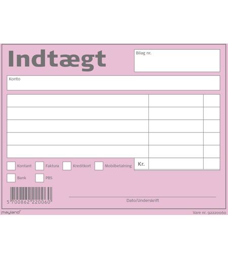 Blok med indtægtsbilag Mayland-Burde producerer hvert år flere millioner kalendere til alle formål og har siden 1900-tallet leveret kalendere til danskerne. Sortimentet er baseret og sammensat på baggrund af kundernes ønske om et bredt og tidssvarende udvalg af kalendere. Hos Mayland-Burde bestræber man sig nemlig på at imødekomme kundernes mange forskellige ønsker og behov. Derfor har Mayland udvidet sortimentet med en bred vifte af blanketter og kuponer, designet til at hjælpe med at holde styr på alt fra kassebeholdninger, telefonbeskeder, regninger og garderoben. Her får du en blok med 100 indtægtsbilag, som er en praktisk hjælp til at holde overblikket for virksomheden, der ikke har alle økonomiske postering online. Der er felter til at anføre bilagsnummer, konto, 5 linjer til posteringer, total, modtagelses-art og underskrift. Mål (BxH): 148x100 mm Antal blade: 100 Farve på skema: Rosa Blanket fremstillet af FSC-certificeret papir og andre kontrollerede materialer ...