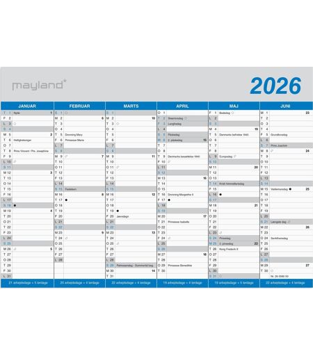 Du får her en vendbar kontorkalender for året 2026. Kalenderen, der er i karton, har et klassisk design og en 2x6 måneders oversigt, så du kan se et halvt år ad gangen. På den måde kan du hurtigt og nemt skabe dig et godt og overskueligt overblik over året og alle dets aktiviteter. I bunden af kalenderen er der angivet antallet af arbejdsdage for hver måned. Kalenderen hænges let på væggen, så du, kontoret eller familien altid kan følge med i årets planer. Fordele ved brug af klassisk kontorkalender Halvårsvisning pr. side – få hurtigt overblik over seks måneder ad gangen Kompakt og diskret format – A5-størrelse der passer til alle typer rum Arbejdsdagsoversigt – hjælper med effektiv planlægning måned for måned Halvårsoverblik og arbejdsdagsvisning Kalenderen er trykt på kraftigt FSC®-mærket karton og kan hænges op på væggen med et enkelt søm. Nederst på hver side vises antallet af arbejdsdage pr. måned – en nyttig funktion i forhold til ressourceplanlægning og mødebooking. Den klare opsætning gør det nemt at aflæse datoer og planlægge fremadrettet. Specifikationer 6 måneder pr. side Gælder for året 2026 Gælder fra 1/1-2026 til 31/12-2026 Vendbar vægkalender i karton Kalenderskema trykt på FSC®-mærket karton A5-format: 21 x 14,8 cm Mayland Burde - kalendere til danskerne siden 1900-tallet Mayland-Burde producerer hvert år millioner af kalendere til alle formål og har siden 1900-tallet leveret kalendere til danskerne. Sortimentet er baseret og sammensat på baggrund af et ønske om et bredt og tidssvarende udvalg af kalendere. Hos Mayland-Burde bestræber man sig nemlig på at imødekomme de forskellige ønsker og behov, der er, når man bruger en kalender, og de har en passion for at kunne levere kalendere, der skaber både glæde og overblik i hverdagen, på jobbet og på studiet. Bemærk! Billederne kan være vejledende. De viser det rigtige design, men dage og datoer stemmer muligvis ikke overens med det givne år.Tidligere års varenumre 25058000 24058000 23058000 22058000 21058000 ...