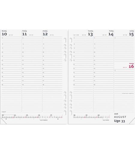 Du får her en refill til din A5 systemkalender, som gælder for året 2026. Kalender-refillen er inddelt med en uge pr. opslag og indeholder et timeopdelt kalenderskema i moderne layout fra kl. 8-18, så du nemt kan overskue ugens planer og aktiviteter. Dertil finder du bl.a. nederst på hvert opslag en tidslinje og månedsoversigt. Fordele ved brug af A5 System ugekalender refill Moderne ugeopslag – med tydelig tidsinddeling og smart oversigt Omfattende indhold – inkl. projektplan, årsoversigt og farveatlas Fleksibel refill – passer til A5-systemkalendere med multihuller Alt du har brug for samlet ét sted Denne praktiske refill passer til alle A5 systemkalendere og gør det let at opdatere din eksisterende kalender. Refillen indeholder mere end blot kalenderopslag – du får også en projektplanner, en udfoldelig årsoversigt, praktisk information, farveatlas og en separat mappe med index planner og telefonregister. Multihuller gør det nemt at indsætte siderne i din eksisterende A5-kalender, så du hurtigt kan tilpasse den efter dine Specifikationer Refill til systemkalender A5 1 uge i højformat pr. opslag Gælder for året 2026 Gælder fra 1/1-2026 til 31/12-2026 Indeholder: Kalenderskema, tidslinje, månedsoversigt, en udfoldelig årsplanner for 2026-2027, en projektplanner for 2026, atlas i farver, masser af praktisk information, lynopslag samt separat mappe med index planner og telefonregister Multihuller Kalenderskema trykt på FSC®-mærket papir A5-format: 14,8 x 21 cm Mayland Burde - kalendere til danskerne siden 1900-tallet Mayland-Burde producerer hvert år millioner af kalendere til alle formål og har siden 1900-tallet leveret kalendere til danskerne. Sortimentet er baseret og sammensat på baggrund af et ønske om et bredt og tidssvarende udvalg af kalendere. Hos Mayland-Burde bestræber man sig nemlig på at imødekomme de forskellige ønsker og behov, der er, når man bruger en kalender, og de har en passion for at kunne levere kalendere, der skaber både glæde og overblik i hverdagen, på jobbet og på studiet. Bemærk! Billederne kan være vejledende. De viser det rigtige design, men dage og datoer stemmer muligvis ikke overens med det givne år. Tidligere års varenumre 25295000 24295000 23295000 22295000 21295000 ...