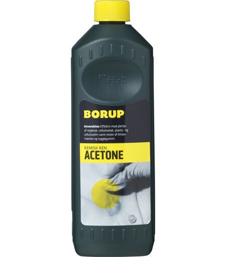 Acetone – god til pletfjerning og rensningAcetone fra Borup er effektivt til fjernelse af pletter og rester fra b.la. neglelak, celluloselak, celluloselim, plastlim, klistermærker, tyggegummi, olie, læbestift og læderfarve. Dertil er acetone god til rensning af f.eks. pensler og værktøj som har været anvendt til celluloselak, fernis og maling. Efter rensningen skal værktøjet dog efterfølgende vaskes i sæbevand. Acetone er ydermere godt til at rense sko og læder, da det effektiv fjerner fedt og snavs. Borup acetone kan også bruges som neglelakfjerner, men da ufortyndet acetone er hårdt mod hænder og negle er det vigtigt at du efterfølgende bruger en god og fed håndcreme. Ellers kan du vælge at blande 1 del acetone, 2 dråber glycerin 86 % og 1 del isopropylalkohol 99 %, for en mere skånsom fjernelse af neglelak. Indhold: 500 mlKemisk ren acetoneEffektiv pletfjerningBrug så lidt acetone som muligt, og gnid på pletten, indtil den er tør. Husk at ligge et stykke sugende stof under pletten, inden du begynder. Det er også vigtigt at gnide let på og omkring pletten for at undgå skjolder. Det anbefales, at du prøver at gnide på et usynligt sted først. ...
