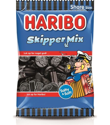 Luk op for Haribo!En god og smagfuld lakridsblandingSkipper Mix er en af Haribos lakridsblandinger og indeholder mange velkendte lakridsvarianter fra Haribos produktsortiment. Blandingen består af forskellige lakridser med forskellig smag, så der er noget for enhver lakridselsker.I posen kan du bl.a. finde Piratos, lakridsbamser, lakridsfisk, samt en række lakridser med tropisk havtema. Lakridserne varierer i smag og der findes både saltlakrids og salmiaklakrids iblandt.Indeholder: LakridsVægt: 375 gUden kunstige farvestoffer ...