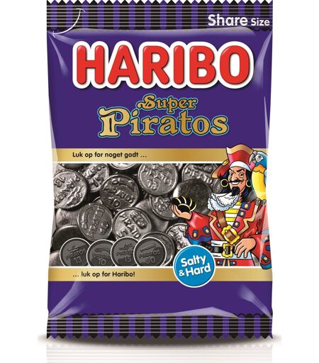 Luk op for Haribo!En velkendt lakridsfarvorit og klassiker!Super Piratos er en slikpose, med den klassiske Piratos lakrids, bare i større format. Lakridsen er hård og har en god og stærk smag af saltlakrids. Piratos indeholder en mindre del salmiak, som fungerer som smagsforstærker, således at lakridsen får en ekstra stærk og kraftfuld smag.Indeholder: LakridsVægt: 340 gUden kunstige farvestoffer ...