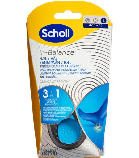Scholl In-balance sålen hjælper med at absorbere stressinducerende shocks igennem underkroppen. Sålen gør, at trykket fra kropsvægten spredes mere jævnt over foden. Derudover bliver fodens position stabiliseret, så ens naturlige måde at gå på, støttes. Sholl In-Balance sålen reducerer stød på ledbånd og sener og hjælper dermed til at lindre smerter i hælen. Str. large passer til str. 42-45 i sko. Bemærkning Hvis du har diabetes eller dårlig blodcirkulation, kan du have en risiko for at udvikle fodrelaterede komplikationer. Søg venligst råd fra en læge eller fodterapeut før du bruger dette produkt. Dosis og anvendelse Før brug skal du sikre, at produktet passer godt i skoen. Om nødvendigt kan du tage den eksisterende indlægssål ud. Indlægssålens hæl skal anbringes mod skoens bagside.For nogle mennesker kan det tage lidt tid, før de smertelindrende indlægssåler føles behagelige. Fødderne har brug for at vænen sig til indlægssålens strukturelle egenskaber.Opbyg eventuelt brugen ved at gå med In-Balance Pain Relief indlægssålerne i et stigende antal timer hver dag, indtil du kan gå med dem hele dagen. ...