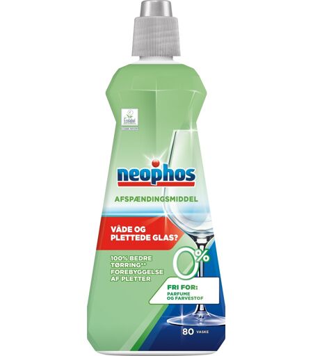 Neophos Afspændingsmiddel 0%Neophos er det førende opvaskemærke på globalt plan og har ligget i front indenfor maskinopvask i mere end 60 år. Samtidig er Neophos verdens største brand inden for maskinopvaskeprodukter og er det mest anbefalede mærke af de førende opvaskemaskineproducenter. Neophos forbedrer kontant deres produkter og følger tidens trends, så du altid er sikret en ren og skinnende opvask mange år frem i tiden og deres mission er at hjælpe deres kunder med at opnå den renest mulige opvask hurtigt og nemt.Neophos Afspændingsmiddel 0% er et miljøcertificeret afspændingsmiddel uden parfume og farvestoffer, som effektivt fjerner alle madrester og vanddråber og efterlader intet mindre end strålende glans til dit service. Rester fra mad og opvaskemiddel kan sætte sig på dit service under opvaskeprocessen og efterlade pletter og samtidig er vådt service efter opvasken et velkendt og irriterende problem, da det ofte er nødvendigt at tørre servicet efter i hånden. Neophos Afspænding 0% virker i maskinens sidste opvaskefase. Afspændingsmidlet forhindrer, at vand eller rester fra mad og opvaskemiddel bliver siddende - og giver dig tørt og skinnende service, direkte fra maskinen!Indhold: 400 mlFjerner effektivt rester fra mad og opvaskemiddelForhindrer vandmærker og forkorter tørretiden0% parfume0% farvestofferMærket med EU-Blomsten ...